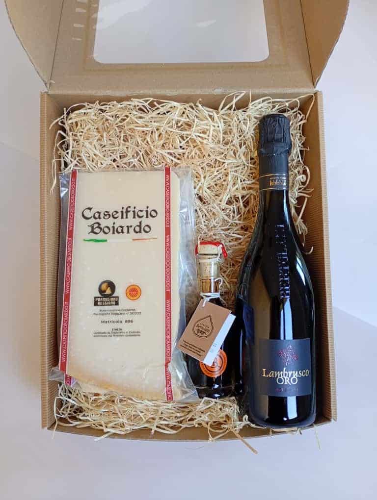 Una botella de 100 ml de Aceto Balsámico Tradicional de Reggio Emilia DOP – Sello Aragosta, una pieza de aproximadamente 1 kg de Parmigiano Reggiano 24 meses y una botella de Lambrusco Oro de la bodega Bertolani de Scandiano.