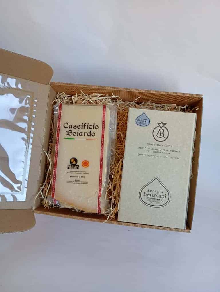 Caja E con Vinagre Balsámico Tradicional de Módena DOP “Aragosta” en estuche regalo y Parmigiano Reggiano de 24 meses